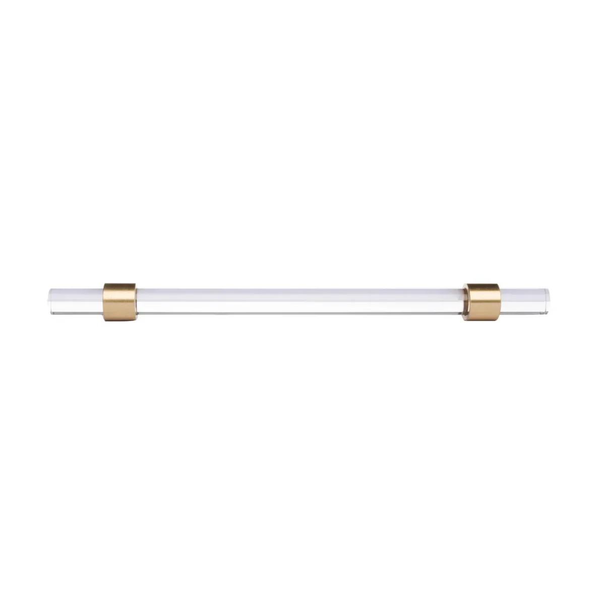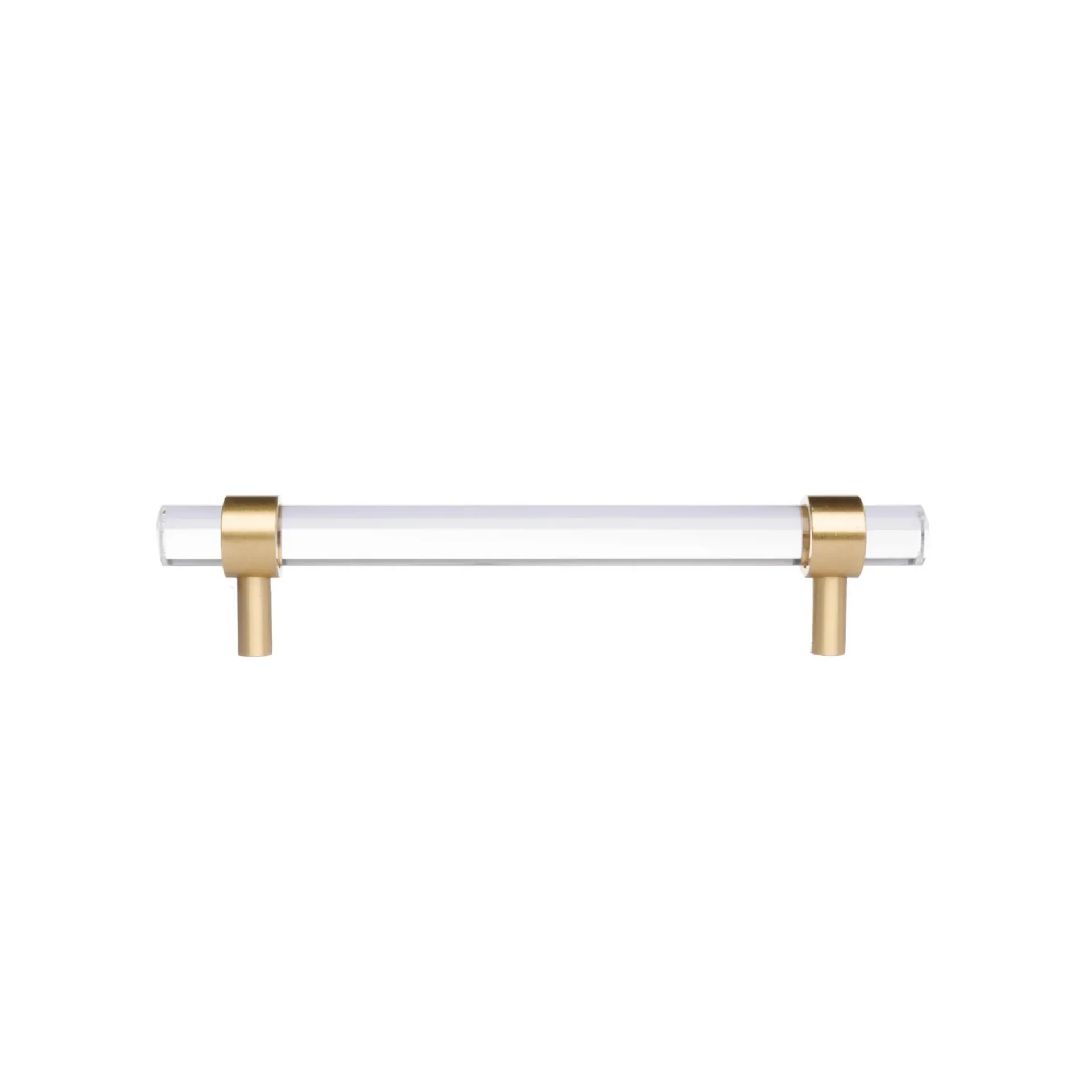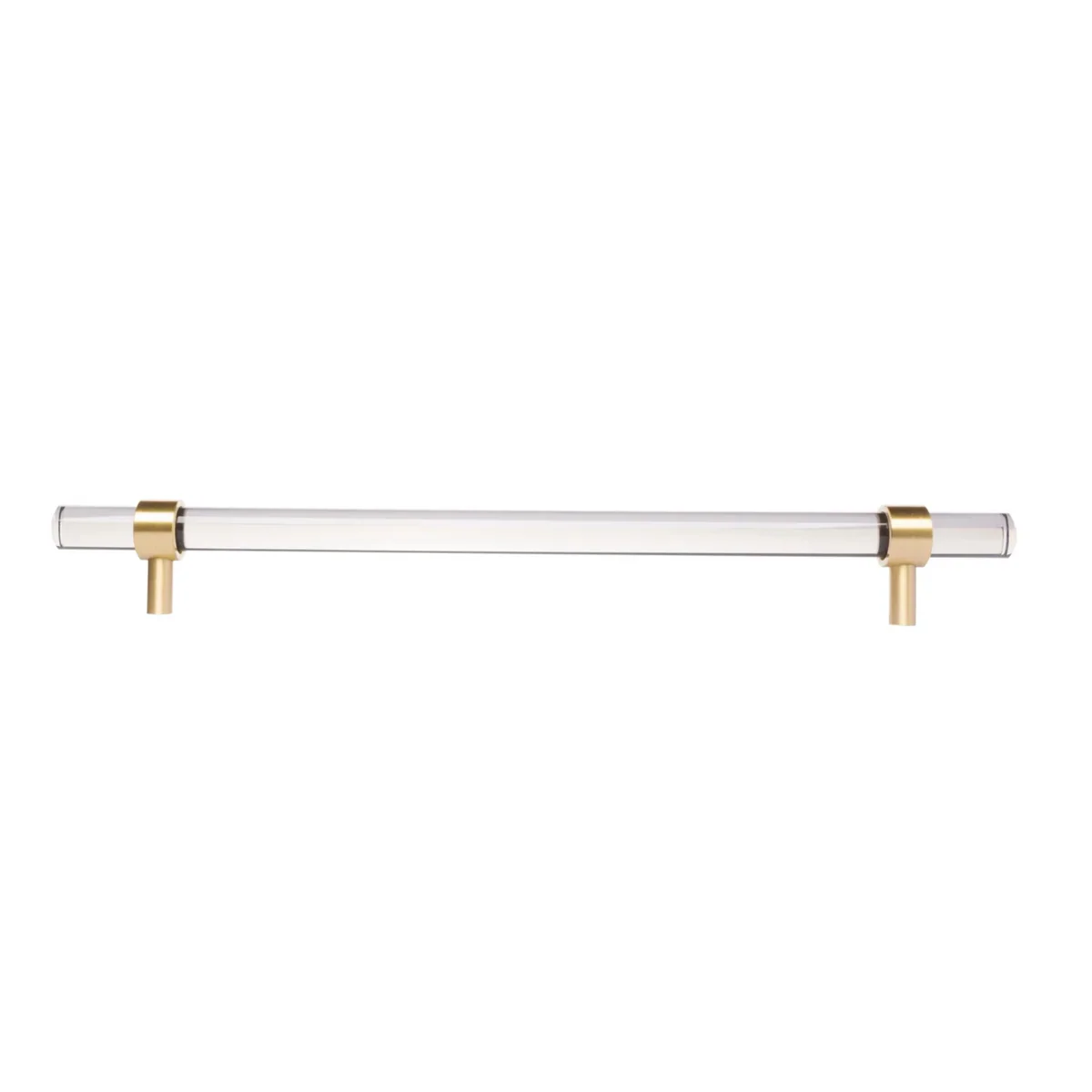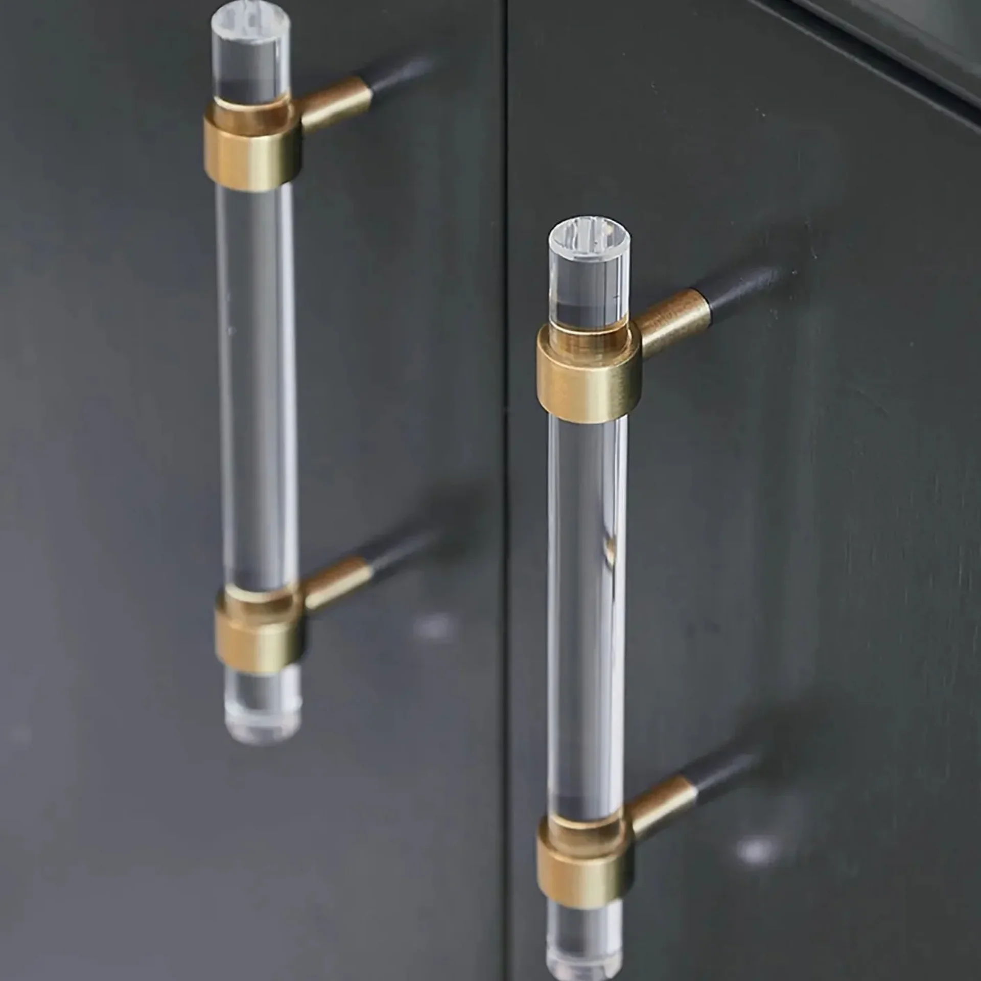 Give your furniture a light, contemporary update with the Clear Acrylic & Brass Handles. These elegant pulls are a perfect blend of modern materials, featuring a smooth, transparent acrylic bar and sleek brushed brass collars and feet. The clean contrast between the clear material and the solid golden brass creates a unique and sophisticated “floating” effect on your cabinets.
