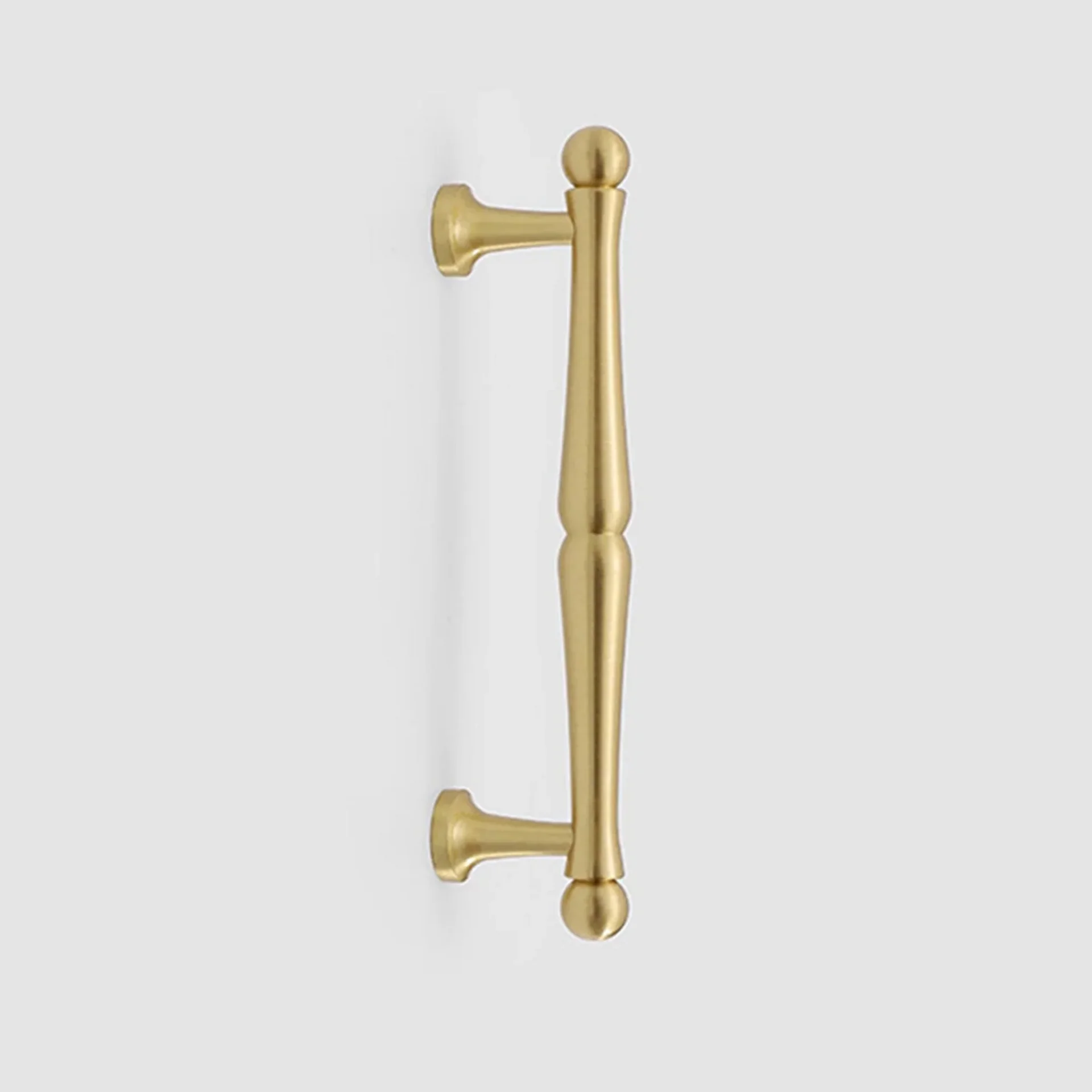 Elevate your cabinetry with the elegant Nishilia Tapered Brass Handles. Crafted from solid brass, these pulls feature a unique design that is thicker in the middle and tapers gracefully towards the ends, creating a sophisticated and streamlined silhouette.